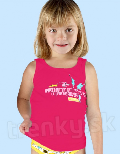 Dievčenské tielko značky Gina s širšími ramienkami rady Disco v bordovej farbe s farebným nápisom a zvieratkami.