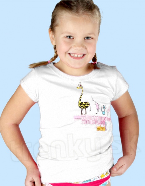 Dievčenské tričko značky Gina s širšími ramienkami rady Disco v bielej farbe s farebným nápisom a zvieratkami.