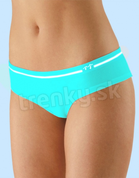 Dámske nohavičky značky Gina s úzkym bokom a širokým lemom rady bamboo v tyrkysovej farbe s bielym pruhom a logom.