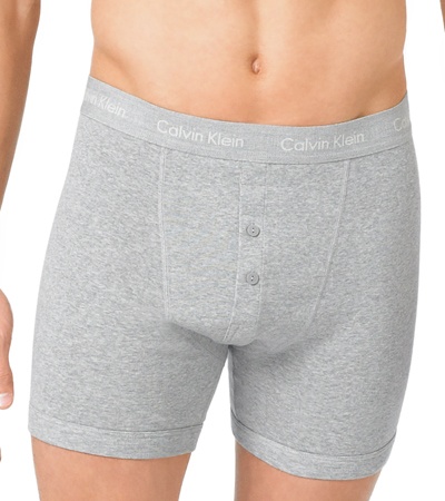 Pánske boxerky značky Calvin Klein s klinom v rozkroku s gombíkmi, v sivej farbe s bielym logom vyšitým na gume.